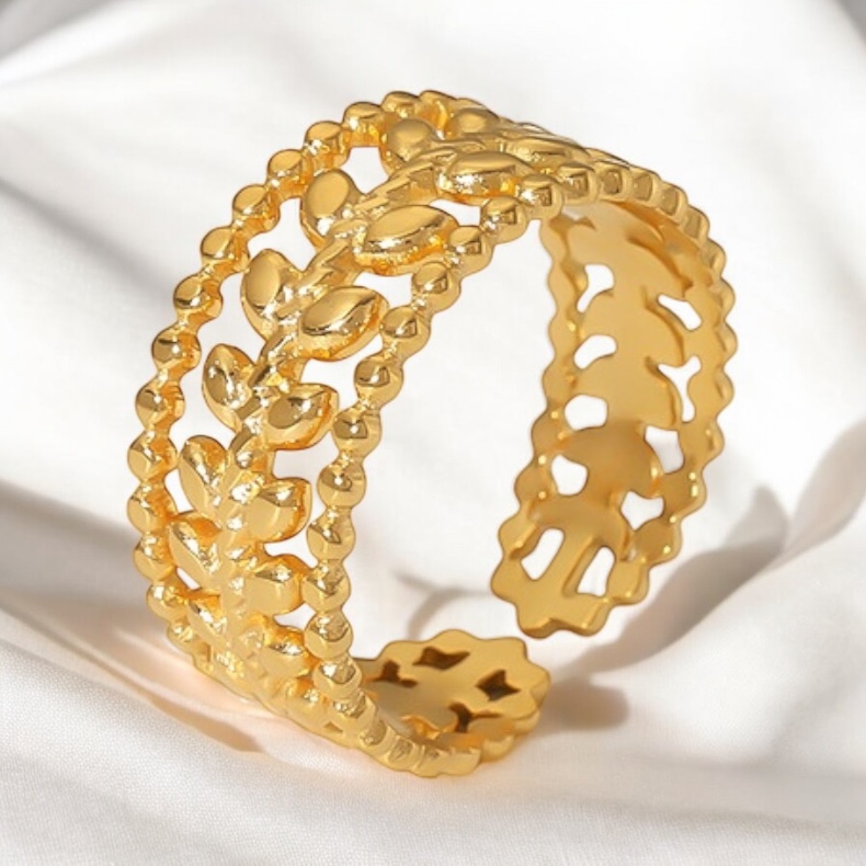 material: stainless Steel, 18K gold plated, Classiifcation: open-adjustable ring. Wt 8 gm, Nature-inspired style lightweight and comfortable...