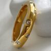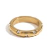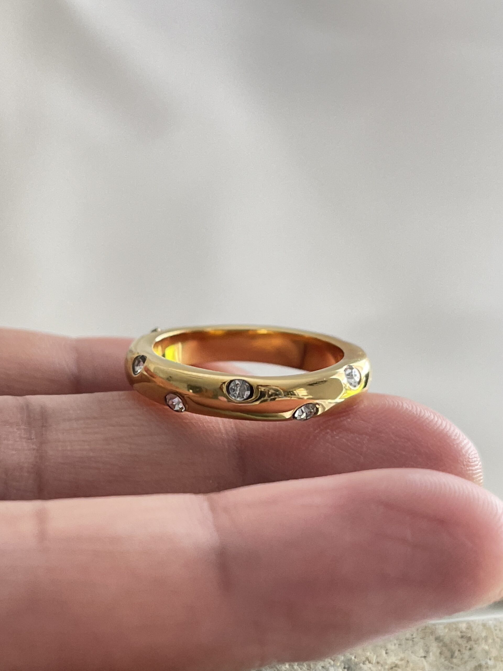 material: Stainless Steel with cubic Zirconia, 18K Gold plated, Size 7. wt 8gm, ring perfect as as standalone statement or stacked with other rings.