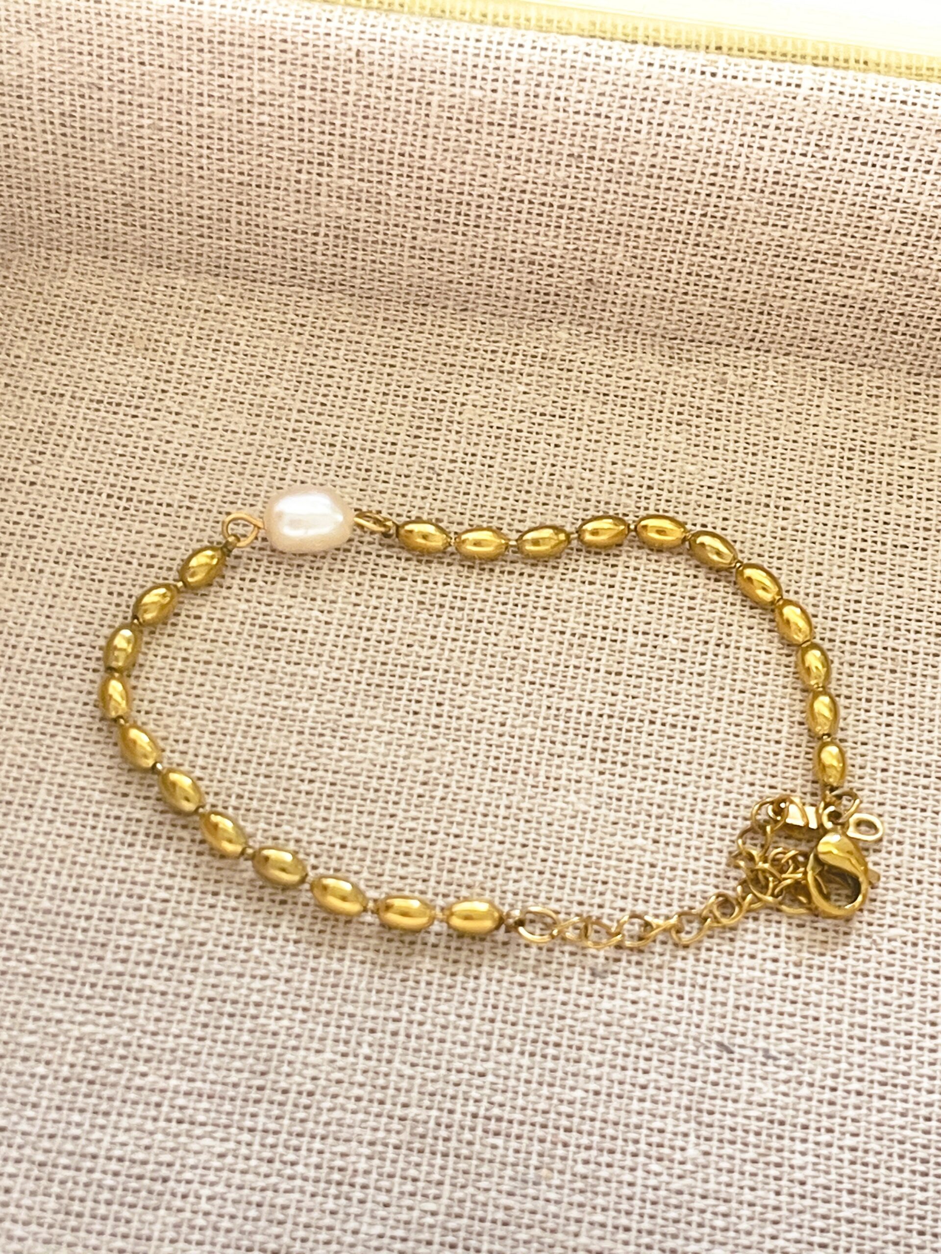 Material: Stainless Steel with Artificial Pearl, 18K Gold plated, Length: 17cm, wt: 10gm, simple minimalistics everyday wear,