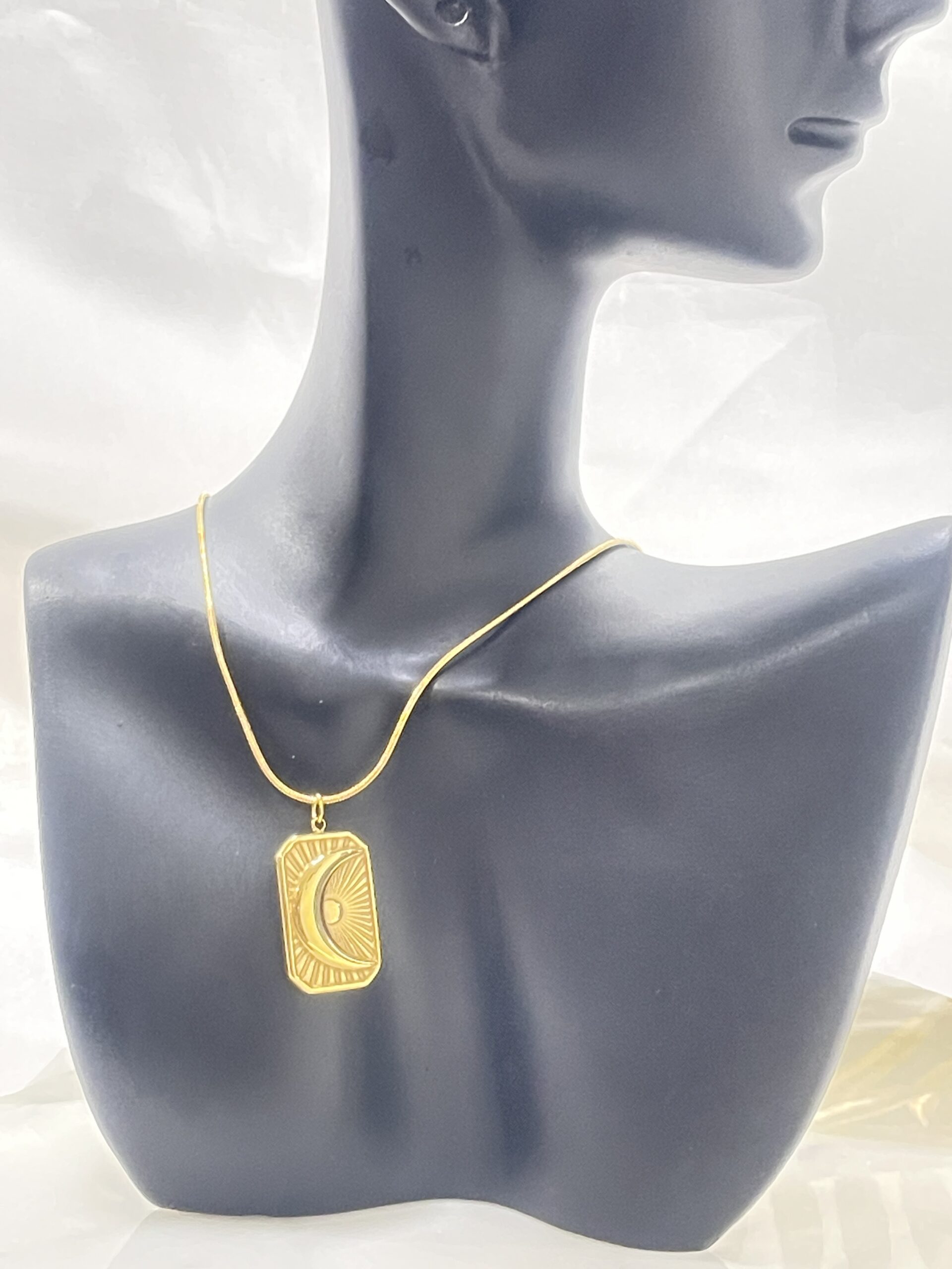 Material: Stainless Steel, 18K gold plated, Classification: Moon Pendant Necklace, Chain: length: 39 Cm, Pendant size: 20mmx13mm, Wt: 6.8g